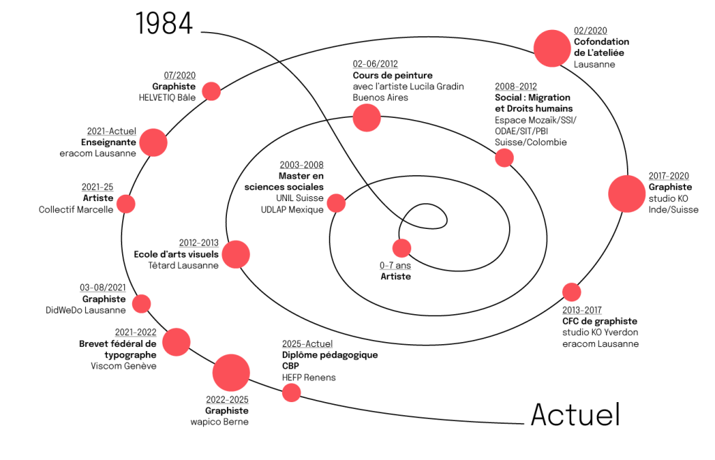 Après un master en sciences sociales, un CFC de graphiste et un Brevet de typographe pour la communication visuelle, je travaille maintenant comme graphiste et enseignante. J’anime aussi différentes activités artistiques dans mon atelier de Lausanne.