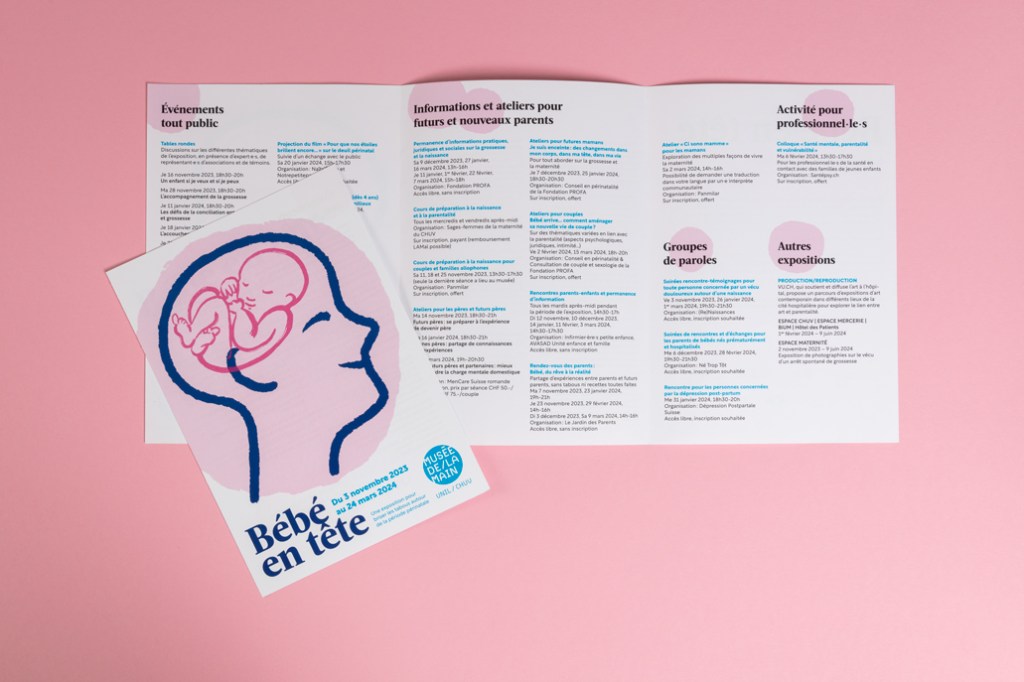 Exposition interactive, itinérante et bilingue (FR/DE) du groupe de recherche périnatale de Lausanne UNIL-CHUV, sur le sujet délicat de la santé mentale lors de la période autour d’une grossesse. Participation à la conception de la scénographie, mise en page des panneaux informatifs, de tous les supports de communication print et web et de certaines illustrations. L’expo est appréciée et montrée à Winterthur et Genève.