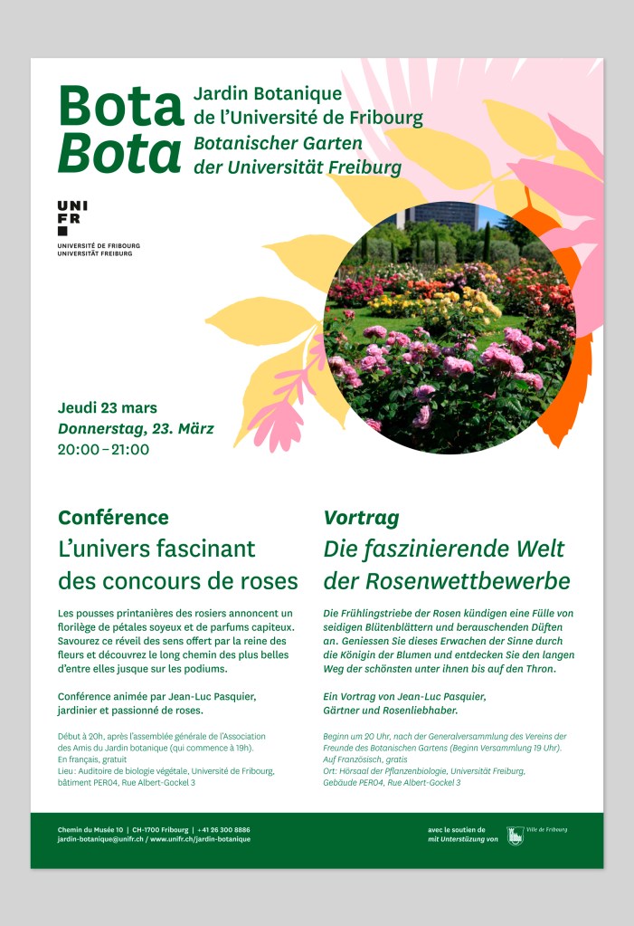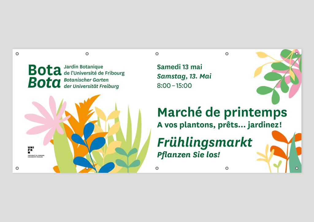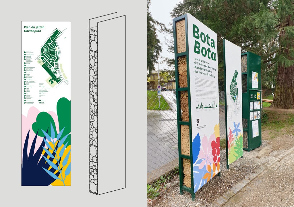 Participation à la mise en œuvre de la nouvelle identité graphique du Jardin botanique de Fribourg.
