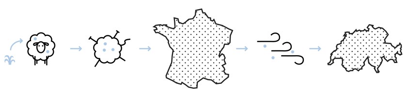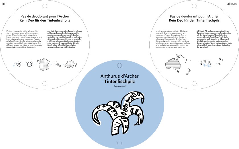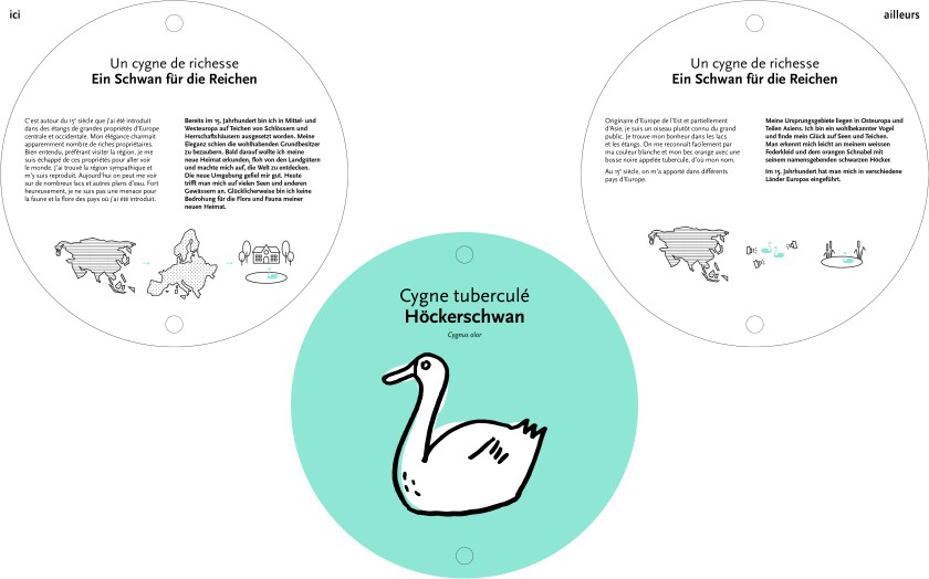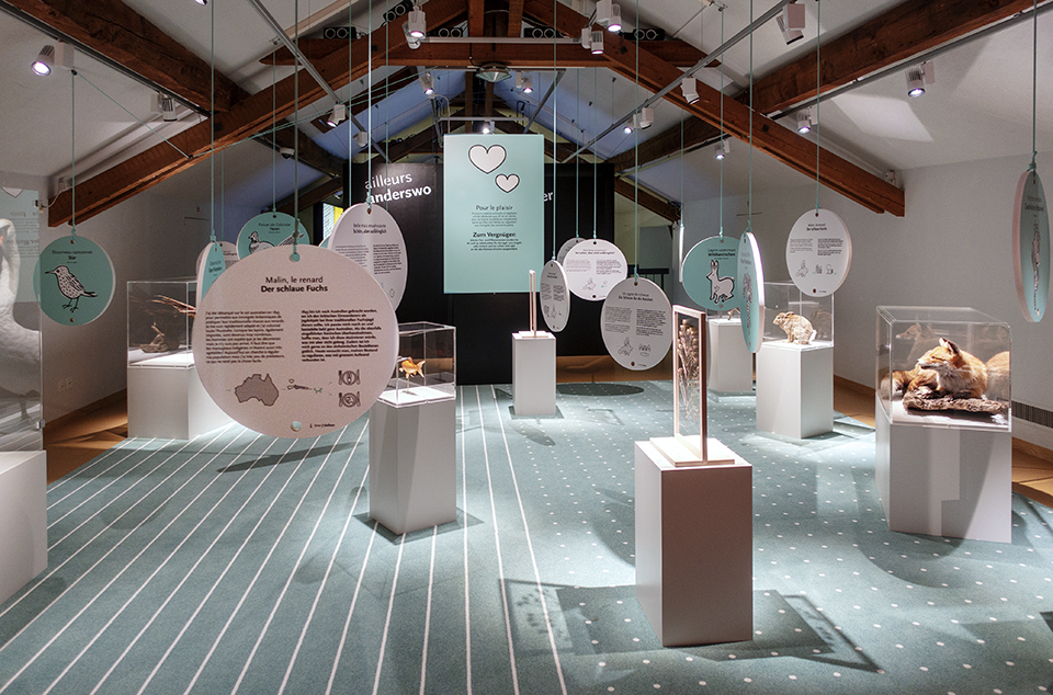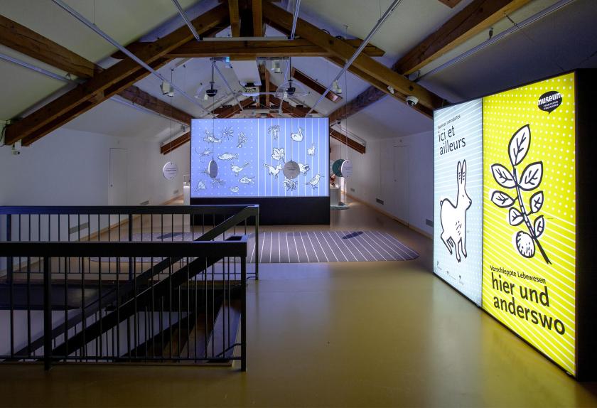 L’exposition temporaire « Ici et ailleurs » permet de distinguer graphiquement l’ici (Suisse) et l’ailleurs (hors Suisse). On découvre en tirant sur des cordes colorées comment les organismes exotiques peuplent de nouveaux habitats, volontairement ou à l’insu des humains. Une invitation à la réflexion sur un des défis de notre monde globalisé.