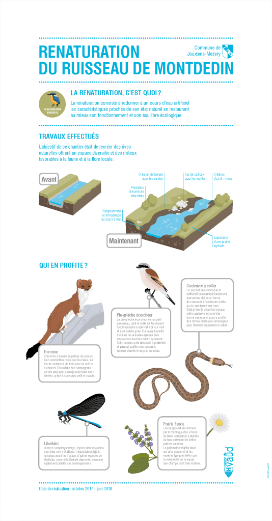 La renaturation c’est redonner à un cours d’eau devenu artificiel les caractéristiques de son état naturel en restaurant au mieux son fonctionnement et son équilibre écologique. Depuis 2013, le studio KO conçoit des panneaux didactiques qui présentent les ouvrages de renaturation du canton de Vaud et leur impact sur l’environnement.